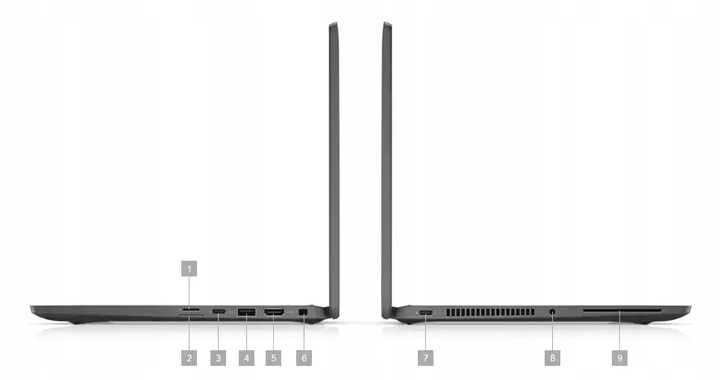 1. Gniazdo na zewnętrzną kartę uSIM (opcjonalnie) | 2. Uniwersalne gniazdo audio | 3. Port USB 3.1 pierwszej generacji z funkcją PowerShare | 4. Gniazdo blokady klinowej | 5. HDMI 2.0 | 6. Port Thunderbolt™ 3 z obsługą standardu Power Delivery i złącza DisplayPort (USB Type-C™) | 7. Port Thunderbolt™ 3 z obsługą standardu Power Delivery i złącza DisplayPort (USB Type-C™) | 8. Czytnik kart pamięci uSD 4.0 | 9. Czytnik kart Smart Card (opcjonalnie)