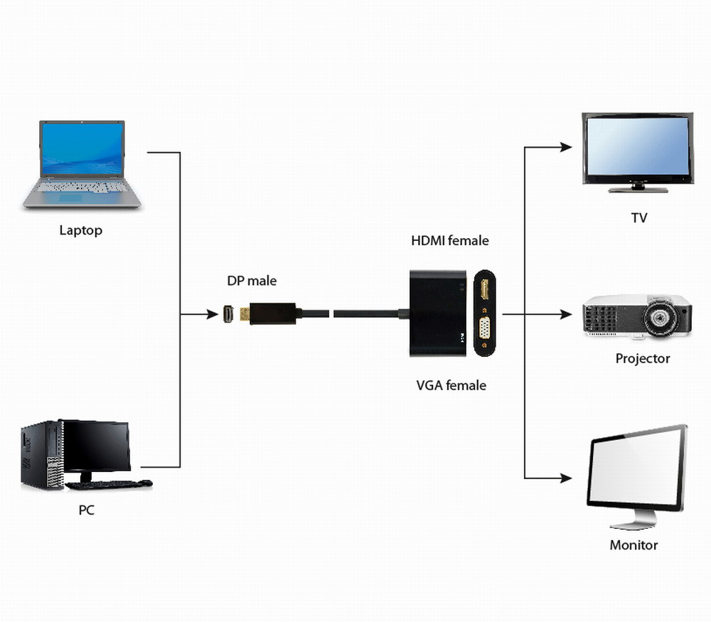 - Idealny do podłączenia wyświetlacza HDMI lub VGA do źródła wideo DisplayPort (porty wyjściowe nie mogą być używane jednocześnie)