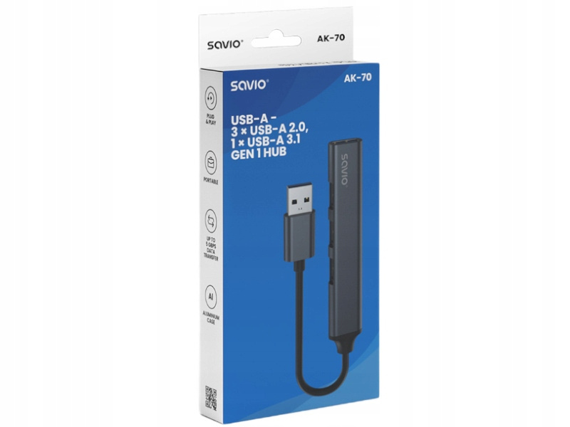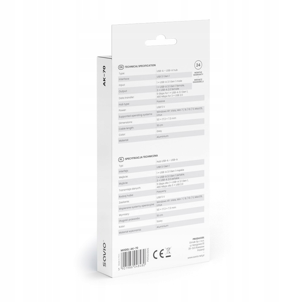 - Akcesoria w zestawie: Hub SAVIO AK-70USB-A - 3 × USB-A 2.0, 1 × USB-A 3.1 Gen 1 Instrukcja obsługi
