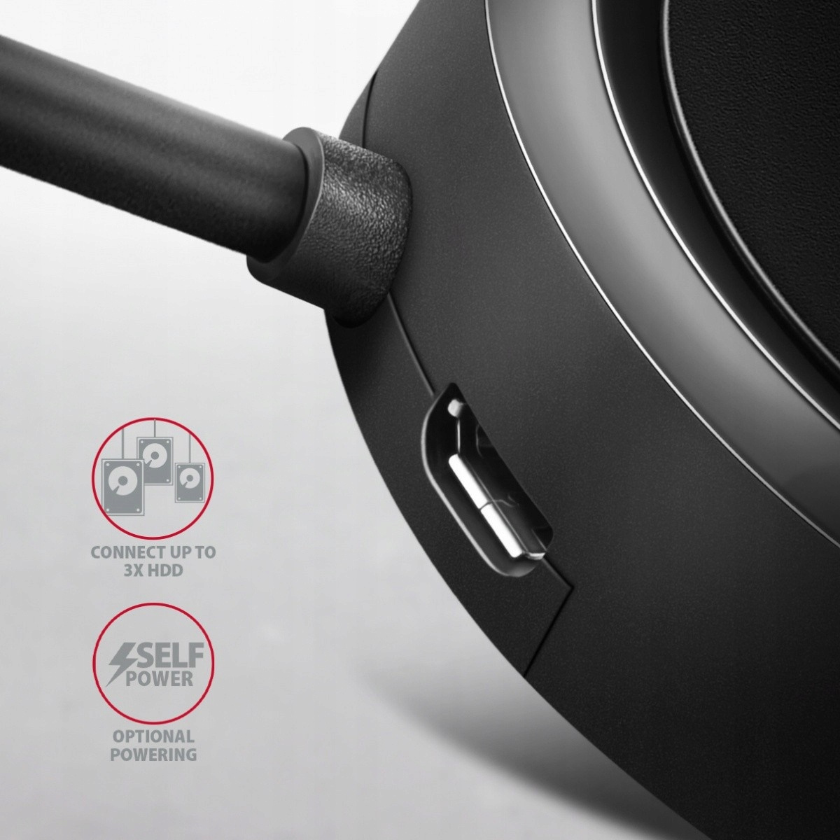 Tryb zasilania huba przez USB + zewnętrzna ładowarka USB (self power): Zintegrowane złącze micro USB do dodatkowego zasilania huba. Do dodatkowego zasilania koncentratora można użyć dowolnej ładowarki ściennej do urządzeń mobilnych (brak w zestawie) ze złączem micro USB (zalecany prąd wyjściowy ładowarki min. 2A). W tym trybie zasilania koncentrator USB może pracować do 3 magnetycznymi dyskami zewnętrznymi 2.5 ". Ten tryb zalecany jest do połączenia ze smartfonami i tabletami. Ładowanie urządzeń mobilnych (w tym iPad) prądem do 1.5A w każdym z portów koncentratora. Całkowity prąd ładowania (który jest podzielony na porty) osiąga do 4.5A przy 5V (w zależności od możliwości zewnętrznej ładowarki ściennej).