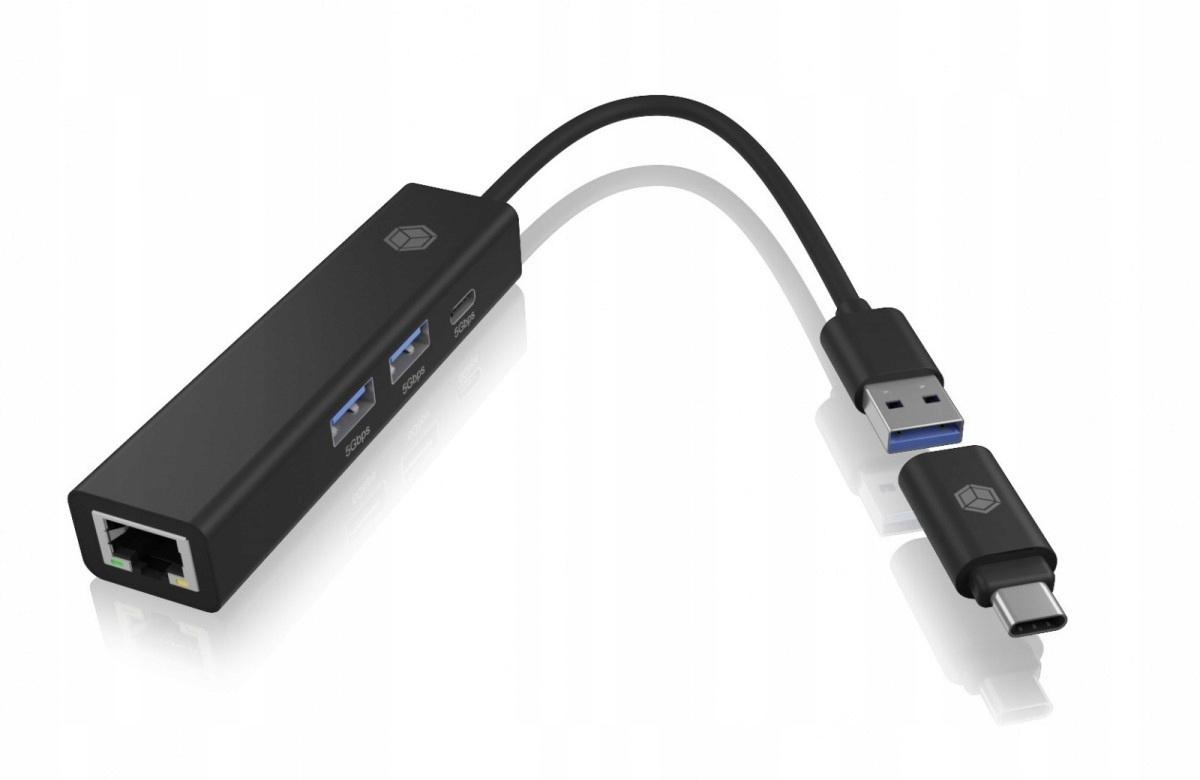 IB-HUB1439-LAN HUB 4-portowy z portem USB 3.2 Gen 1 Type-A lub Type-C Adapter 4 w 1 - USB 3.2 Gen 1 na Gigabit LAN i 3x USB 3.2 Gen 1 2x USB Type-A, 1x USB Type-C, 1x RJ45 Gigabit Ethernet LAN Obsługuje połączenie hosta USB-A i USB-C za pomocą dołączonego adaptera Szybkość przesyłania danych do 5 Gbit/s (USB) i 1 Gbit/s (LAN) Obsługuje funkcję Wake-on-LAN i Wake-on-WAN Obsługuje IEEE 802.3x, 802.3u, 802.3ab, 802.3, 802.1P, 802.1Q, 802.3az-2010 (EEE) Wysokiej jakości aluminiowa obudowa Obsługuje systemy Windows, Chrome OS i macOS z funkcją Plug & Play