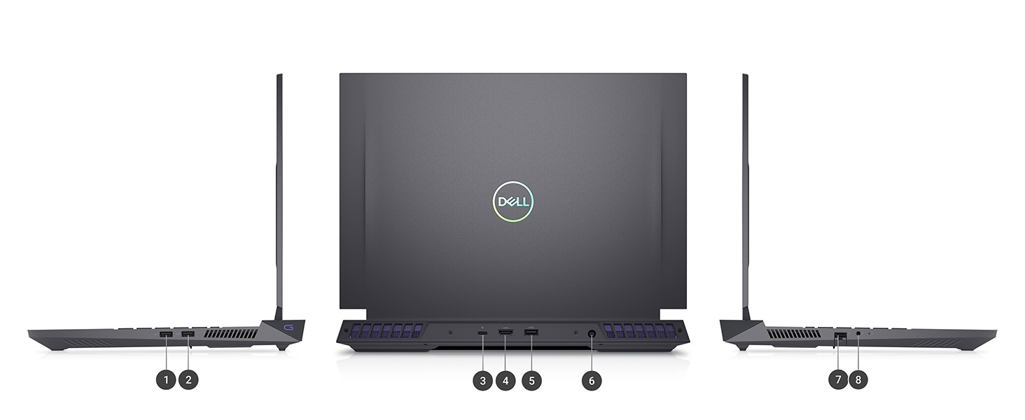 1. Super szybkie USB 3.2 Gen 1 Type-A | 2. Super szybkie USB 3.2 Gen 1 Type-A | 3. USB C 3.2 Gen 2 - Display port | 4. HDMI 2.1 | 5. Super szybkie USB 3.2 Gen 1 Type-A | 6. Złącze zasilania | 7. RJ45 | 8. Złącze słuchawek/mikrofonu