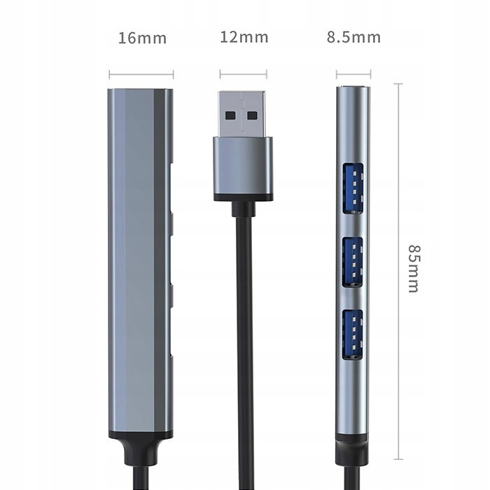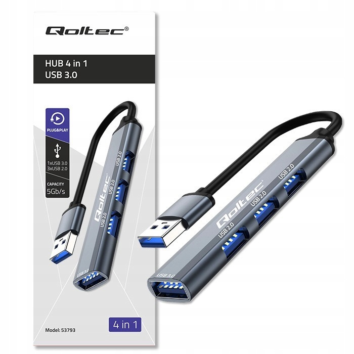 Jeden hub, nieskończone możliwościSzukasz rozwiązania, które pozwoli na rozszerzenie możliwości Twojego laptopa lub komputera? Hub USB marki Qoltec dedykowany jest dla każdego, kto ceni sobie praktyczne rozwiązania ułatwiające organizację pracy i korzystanie z wielu urządzeń jednocześnie. Brak większej ilości portów USB w urządzeniach takich jak na przykład laptop stanowi duży problem. Już teraz nasze urządzenie usprawni i zorganizuje Twoje stanowisko pracy, zyskasz dodatkowe porty USB niezbędne do połączenia kilku urządzeń na raz. Płynna współpraca między urządzeniamiPodłącz wiele urządzeń jednocześnie i ciesz szybkim i niezawodnym przesyłaniem plików oraz płynną współpracą między urządzeniami. Nasz hub pozwoli Ci wpiąć do komputera dodatkowy sprzęt i akcesoria takie jak: myszka, klawiatura, drukarka, pendrive, dodatkowy monitor, projektor, słuchawki, głośniki i wiele innych. Z naszym urządzeniem, nie musisz wybierać, które urządzenie odłączyć, aby podpiąć kolejne. Hub wyposażony w port USB 3.0 i 3 porty USB 2.0.Wielofunkcyjność w kompaktowym rozmiarzeKompaktowy rozmiar urządzenia sprawia, że jest wyjątkowo praktyczne i wygodne, a niewielka waga pozwoli Ci zabrać go dosłownie wszędzie gdzie jest potrzebne, do pracy, biura lub w każde inne miejsce w czasie podróży służbowej i nie tylko. Bez problemu zmieści się do kieszeni lub plecaka. Obudowa urządzenia została wykonana z wysokiej jakości trwałego aluminium, co dodatkowo pomaga odprowadzać ciepło oraz zapewnia skuteczną ochronę przed zgnieceniem i zabezpiecza przed wszelkimi uszkodzeniami.Podłącz i działajTo dzięki funkcji Plug-and-Play, po podłączeniu do laptopa nasze urządzenie jest gotowe do użycia bez konieczności instalowania dodatkowych sterowników, wystarczy podłączyć kabel USB i możesz zaczynać. Szybka i niezawodna prędkość przesyłania plikówUrządzenia podłączone do huba mogą przesyłać dane z prędkością do 5 gigabitów na sekundę, zapewniając szybkie kopiowanie plików, płynny transfer danych między urządzeniami oraz wydajne korzystanie z zewnętrznych dysków. Pamiętaj jakość podłączonego urządzenia czy też rodzaj kabla również ma swoje ograniczenia prędkości transferu danych. Zadbaj aby wszystkie urządzenia podłączone do huba były zgodne z USB 3.0 i miały zdolność obsługi wysokich prędkości transferu danych.