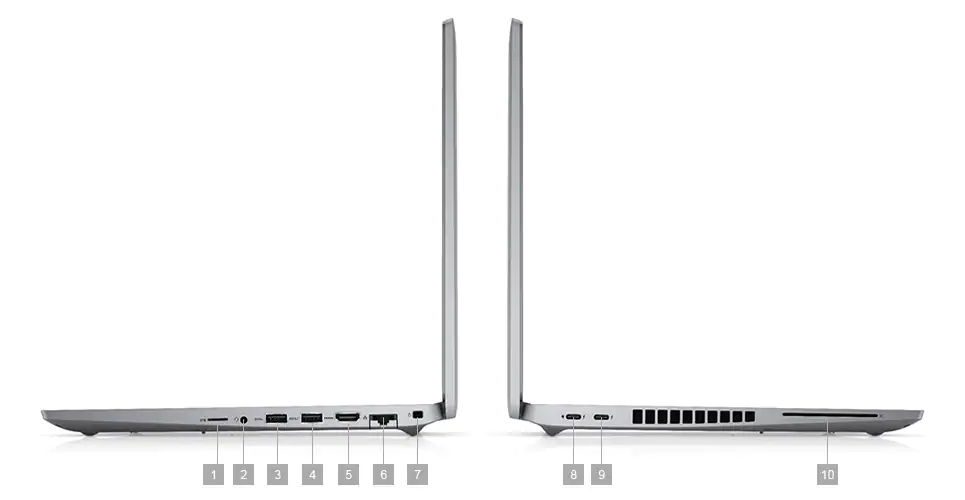 1. Czytnik kart pamięci microSD 4.0 | 2. Gniazdo zestawu słuchawkowego | 3. USB 3.2 z funkcją PowerShare | 4. USB 3.2 | 5. HDMI 2.0 | 6. RJ45 | 7. Gniazdo linki zabezpieczającej Wedge Lock | 8. Port Thunderbolt™ 4 z obsługą standardu Power Delivery i DisplayPort (USB Type-C™) | 9. Port Thunderbolt™ 4 z obsługą standardu Power Delivery i DisplayPort (USB Type-C™) | 10. Czytnik kart Smart Card (opcjonalnie) | 11. Zewnętrzne gniazdo karty eSIM (opcjonalnie, brak na ilustracji z tyłu)