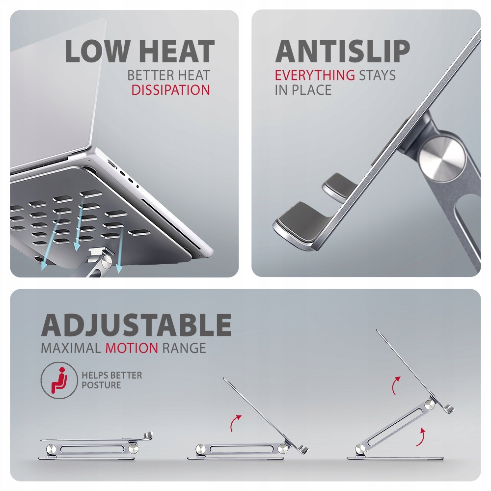 Podstawka wykonana jest zwytrzymałych odlewów aluminiowychgwarantujących długą żywotność i niezawodność. Dzięki antypoślizgowemu wykończeniu nie musisz się martwić o brak przyczepności i niepożądane ruchy - Twoje urządzenie będzie się mocno trzymać na swoim miejscu, nie uszkadzając powierzchni laptopa ani podkładki. Starannie przemyślany projekt zapewnia idealną stabilnośćlaptopa,tabletu, a nawet ulubionejksiążki, zapewniając Ci spokój ducha i komfort podczas codziennego użytkowania.