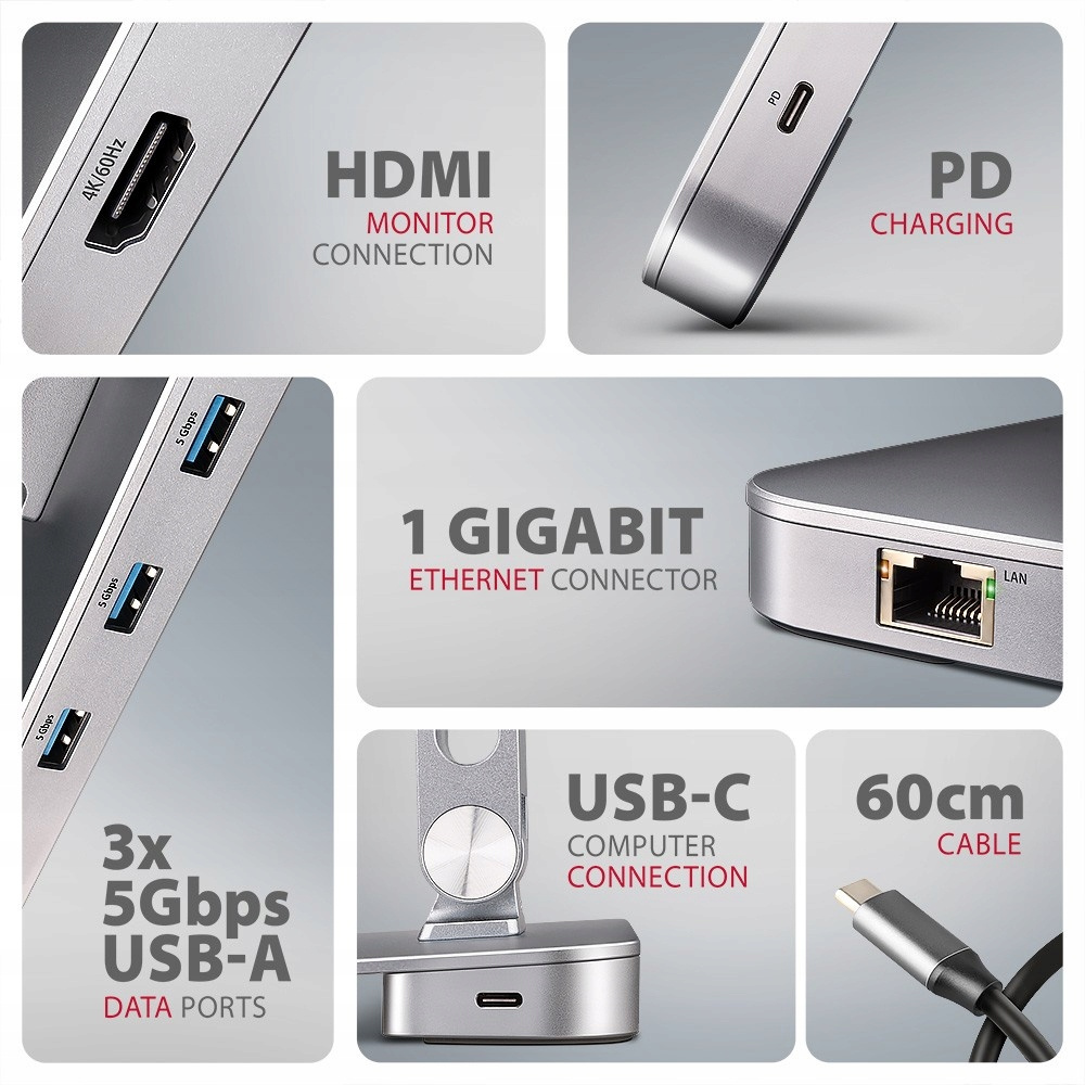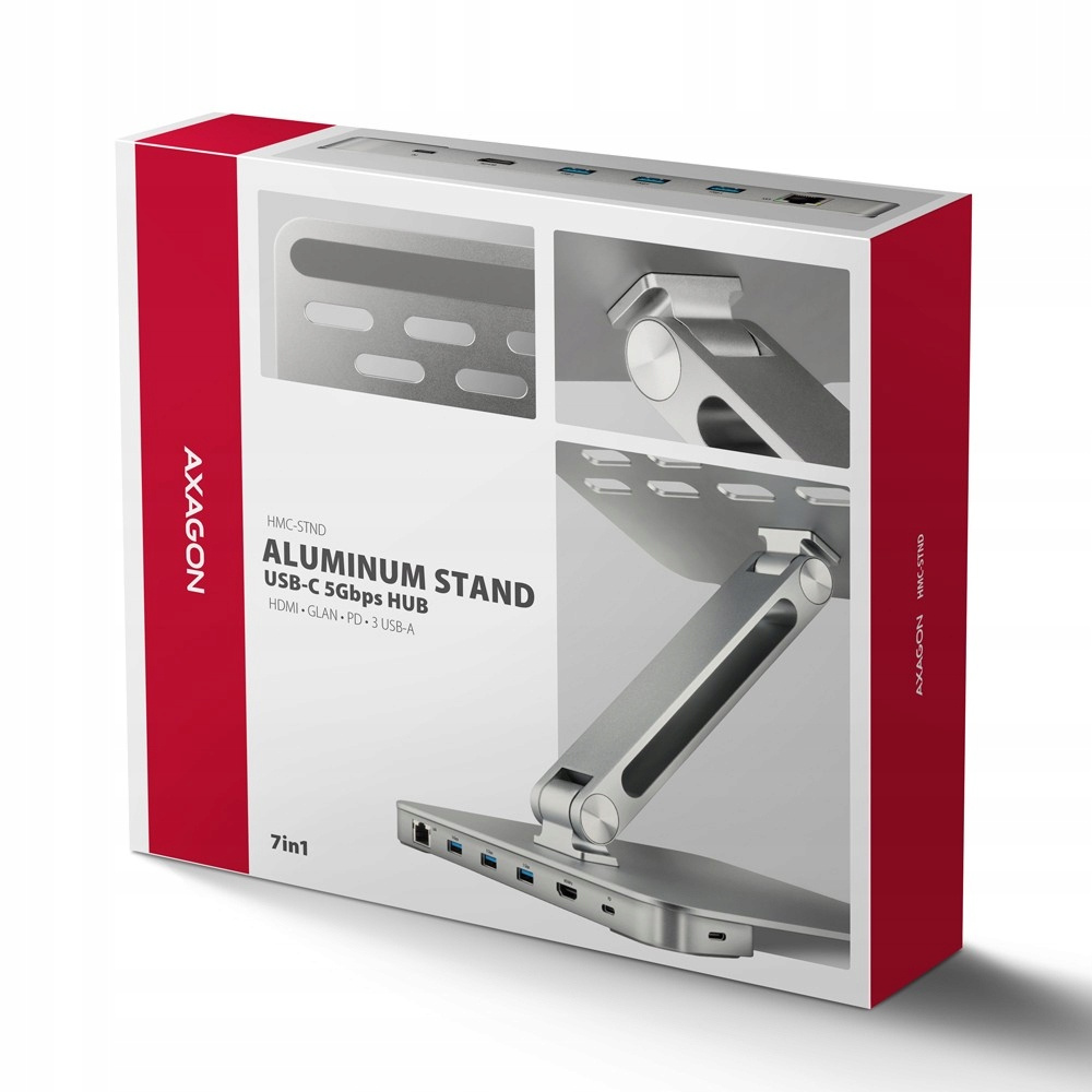 AXAGON HMC-STND 7in1 Hub & Standto wyjątkowy wielofunkcyjny hub zintegrowany z podstawką na laptopa lub tablet. Ten hub rozszerza możliwości laptopa lub tabletu o dodatkowe sześć portów. Podłącz laptopa do huba za pomocą kabla USB-C USB-C o długości 60 cm. Dzięki temu od razu masz podłączenie domonitora, trzech urządzeń USB, złącze RJ-45 dosieci Gigabit Etherneti zasilanie laptopa dzięki technologiiPower Delivery. Podstawkaz dwoma przegubamipoprawia ergonomię i komfort pracy i jest odpowiednia dla urządzeń o przekątnejod 10 " do 16 ". Idealnie sprawdzi się jakostacja dokująca 7in1dla laptopów z systemem Windows iApple MacBook AirlubMacBook Pro.