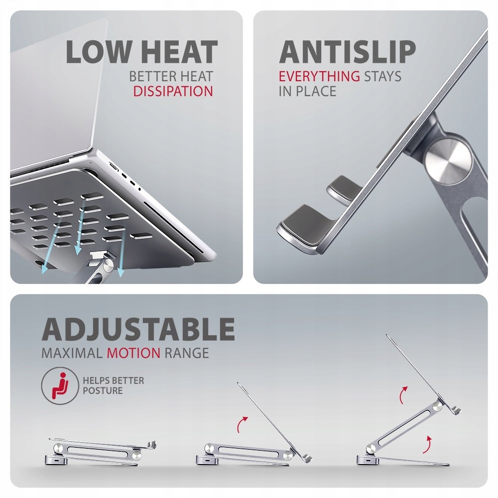 Właściwości stojaka: Lekka i mocna konstrukcja metalowa. Wykończenie antypoślizgowe, które dodatkowo chroni urządzenie przed zarysowaniami. Nadaje się do laptopów 10 " - 16 " i innych urządzeń. Regulowana wysokość do 205 mm. Wiele regulowanych pozycji. Regulowane nachylenie podstawy (180° - 90°) Regulacja nachylenia ramienia (180° - 90°) Kompaktowy i łatwy do złożenia. Lepsze odprowadzanie ciepła z notebooka.
