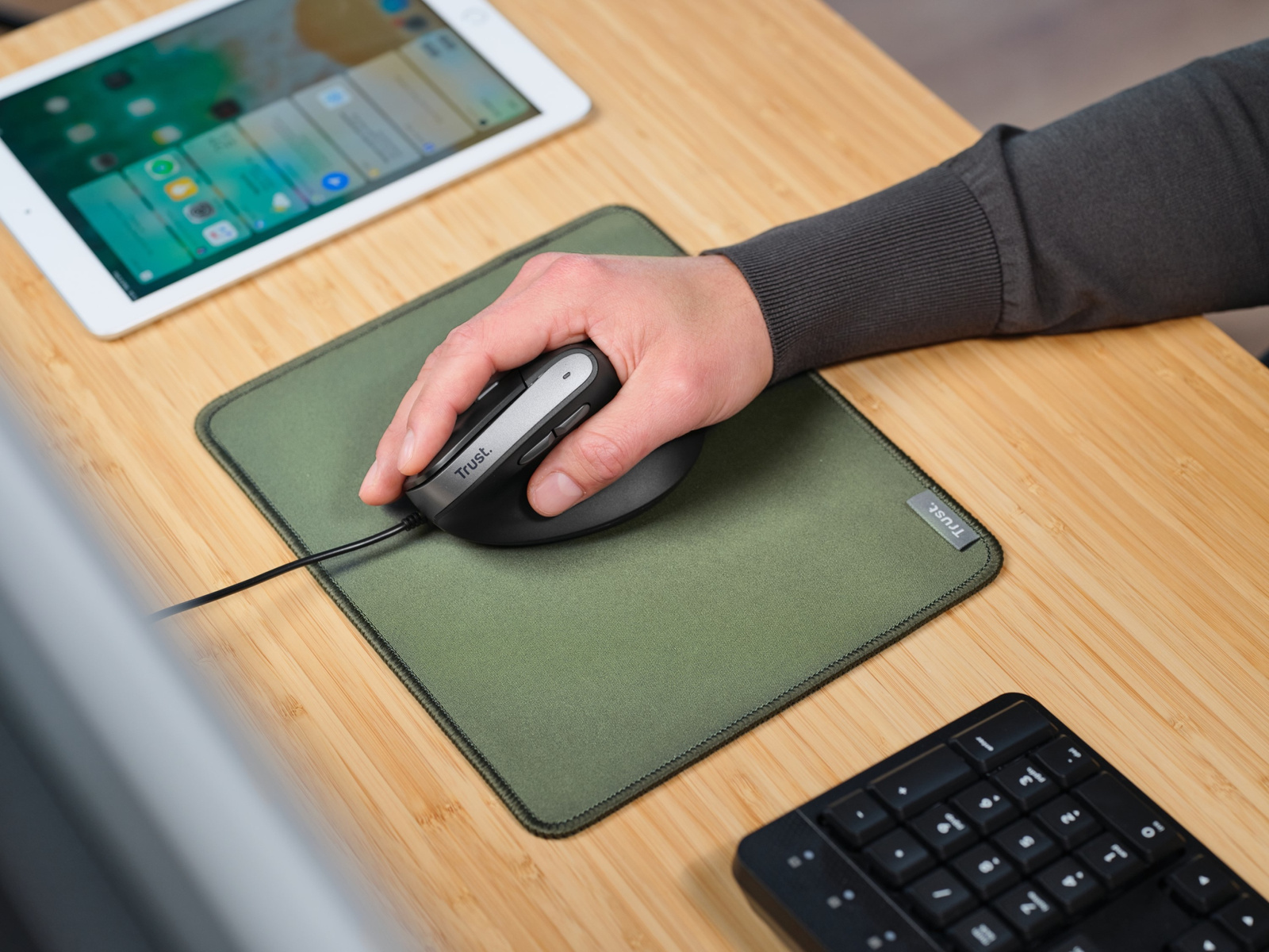 - Optymalny kąt pionowy myszy wynoszący 57 stopni zmniejsza napięcie w przedramieniu i nadgarstku oraz umożliwia komfortowe oparcie kciuka.