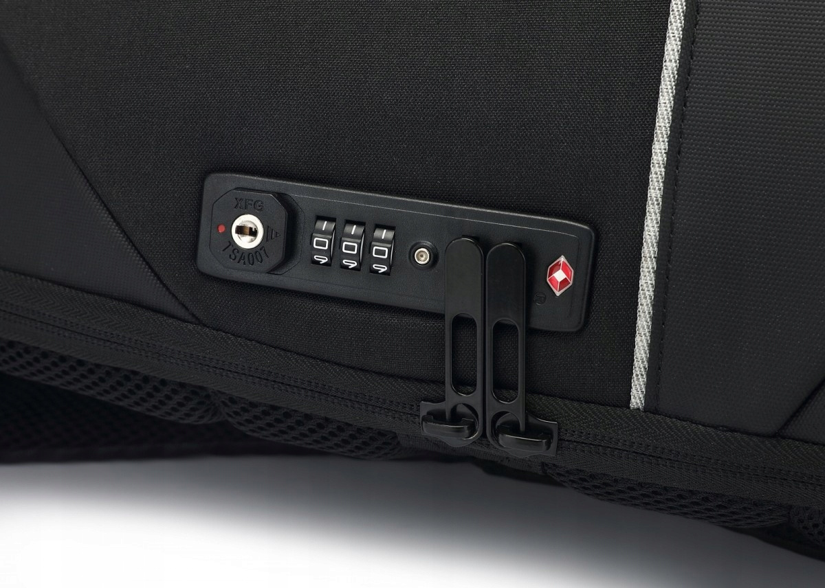 - Plecak można zamknąć przy pomocy certyfikowanego zamka TSA, czyli globalnego systemu bezpieczeństwa, który umożliwia podróżnym zamknięcie bagażu, a jednocześnie pozwala organom bezpieczeństwa na ich kontrolę bez uszkodzenia.